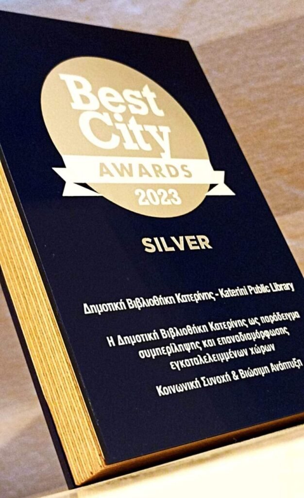 Το Ασημένιο Βραβείο των Best City Awards, που επιβραβεύουν την Καινοτομία και την Ποιότητα Ζωής στις ελληνικές πόλεις απονεμήθηκε στη Δημοτική Βιβλιοθήκη του Δήμου Κατερίνης, στη διάρκεια μιας λαμπερής και δυναμικής Τελετής Απονομής, που πραγματοποιήθηκε τη Δευτέρα 16 Ιανουαρίου, στo Αμφιθέατρο «Μιλτιάδης Έβερτ» στην Τεχνόπολη Δήμου Αθηναίων.