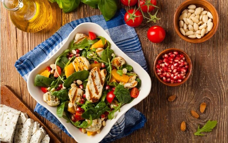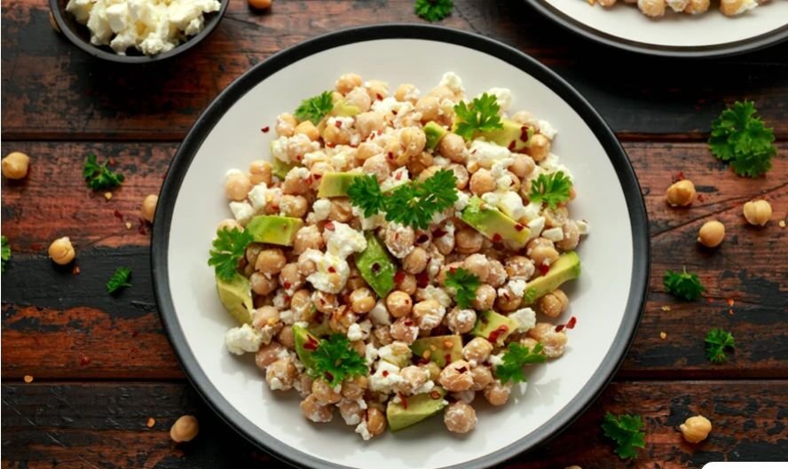 Ρεβιθοσαλάτα Υλικά: 420 γρ. ρεβίθια βρασμένα2 αβοκάντο ψιλοκομμένα1/3 φλ. τσαγιού κόλιανδρο ψιλοκομμένο2 κ. σ. φρέσκο κρεμμυδάκι ψιλοκομμένο1/3 φλ. τσαγιού φέτα σε κύβους ή τριμμένη στο