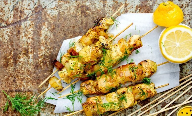 Καλαμάκια κοτόπουλου Υλικά:1/4 φλ. τσαγιού χυμό λεμονιού4 κ. σ. ελαιόλαδο, χωρισμένο3 κ. σ. λευκό κρασί1 1/2 κ. γλ. νιφάδες κόκκινου πιπεριού1 κ. γλ. φρέσκο δενδρολίβανο