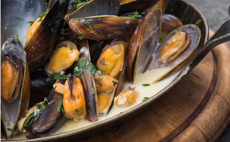 Γαλλικά μύδια Υλικά:1 κιλό μύδια καθαρισμένα2 κ. σ. ελαιόλαδο1 κ. σ. ανάλατο βούτυρο1 κρεμμύδι ψιλοκομμένο4 σκελίδες σκόρδο ψιλοκομμένες1 φλ. τσαγιού λευκό ξηρό κρασί1/2 φλ. τσαγιού