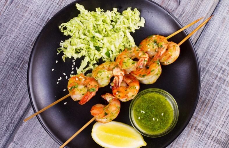 Ψητές γαρίδες Υλικά:1 κ. σ. και 1/2 φλ. τσαγιού dressing για ασιατική σαλάτα450 γρ. άψητες γαρίδες, καθαρισμένες και ξεφλουδισμένεςΣφήνες λάιμ1/4 φλ. τσαγιού ψιλοκομμένο φρέσκο κόλιανδρο