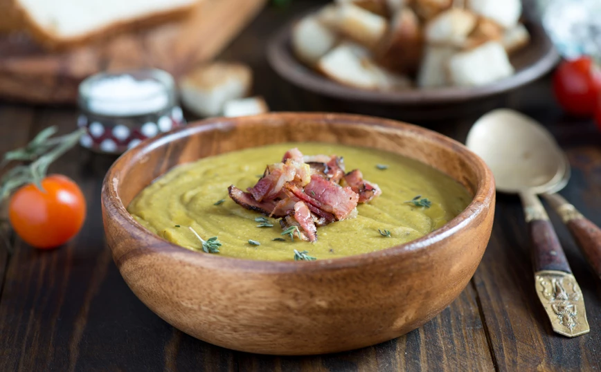 Σούπα με αρακά Εύκολη συνταγή για νόστιμο βραδινό ή συνοδευτικό Υλικά:2 κ. σ. βούτυρο1/2 κρεμμύδι ψιλοκομμένο2 κλαράκια σέληνου ψιλοκομμένα3 σκελίδες σκόρδου ψιλοκομμένες1/2 κιλό μπέικον ψιλοκομμένο1