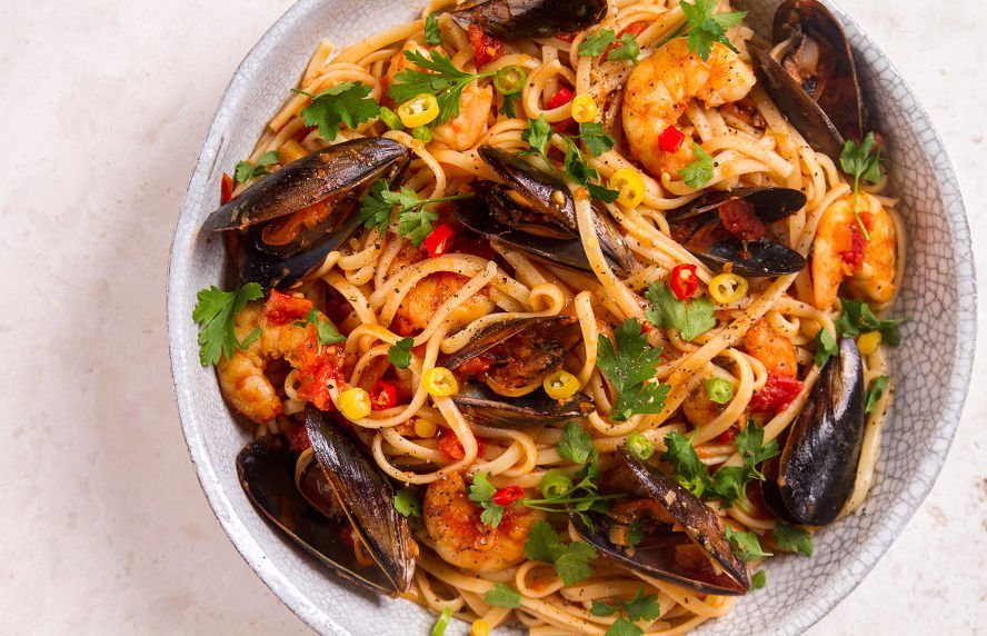 Μακαρονάδα με θαλασσινά Υλικά Συνταγής: 1/3 φλ. ελαιόλαδο1/2 κρεμμύδι πολύ ψιλοκομμένο2 σκ. σκόρδο σπασμένες800 γραμ. φρέσκα μύδια καθαρισμένα και πλυμένα2 καλαμάρια κομμένα σε φέτες300 γραμ.