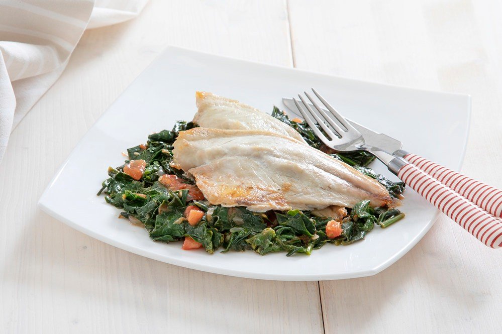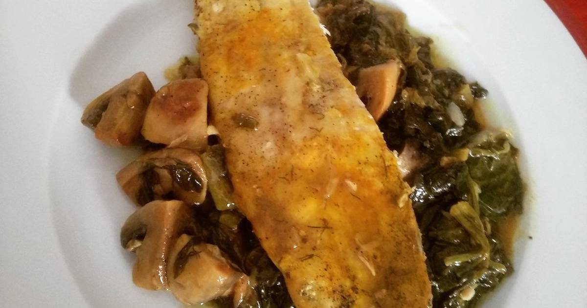 Φιλέτο ψάρι Υλικά: 4 φιλέτα ψάριντομάτα φρέσκια4 baby πατάτες2 σκελίδες σκόρδο2 κούπες σπανάκι κομμένολάδικρεμμυδάκιάνηθο1 ½ κούπα νερό Εκτέλεση Σοτάρουμε το σπανάκι, τα κρεμμυδάκια και τον
