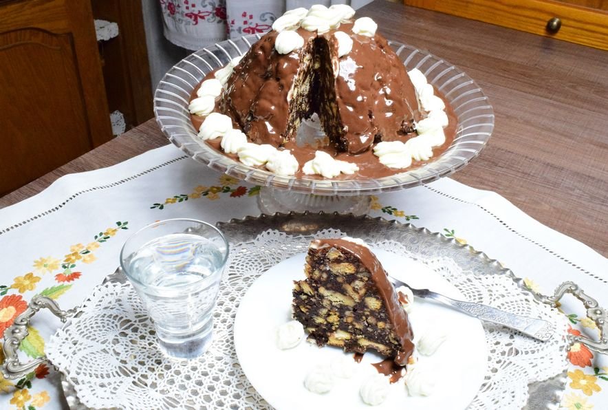 Το κέικ της τεμπέλας Υλικά: 350 γρ. μπισκότα της αρεσκείας σας (κατά προτίμηση σοκολατένια) 2 1/2 κ. γλ. μαγειρική σόδα 1 1/2 φλ. τσαγιού γάλα