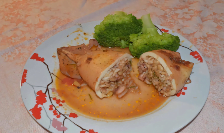 Καλαμάρι με ρύζι Υλικά Συνταγής: 2 καλαμάρια μέτρια φρέσκα καθαρισμένα (σύνολο 700 γραμ. περίπου)2 ½ φλ. ρύζι μακρύκοκκο1/4 φλ. ελαιολαδο2 κρεμμύδια ξερά κόκκινα ψιλοκομμένα1 σκ.