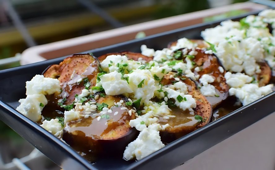 Υλικά: 2 μελιτζάνες αλάτι μαύρο πιπέρι 1 σκελίδα σκόρδο 1 κ.σ. μουστάρδα 1 κ.σ. μέλι 6 κ.σ. ελαιόλαδο 2 κ.σ. ξύδι βαλσάμικο σουσάμι 100 γρ.