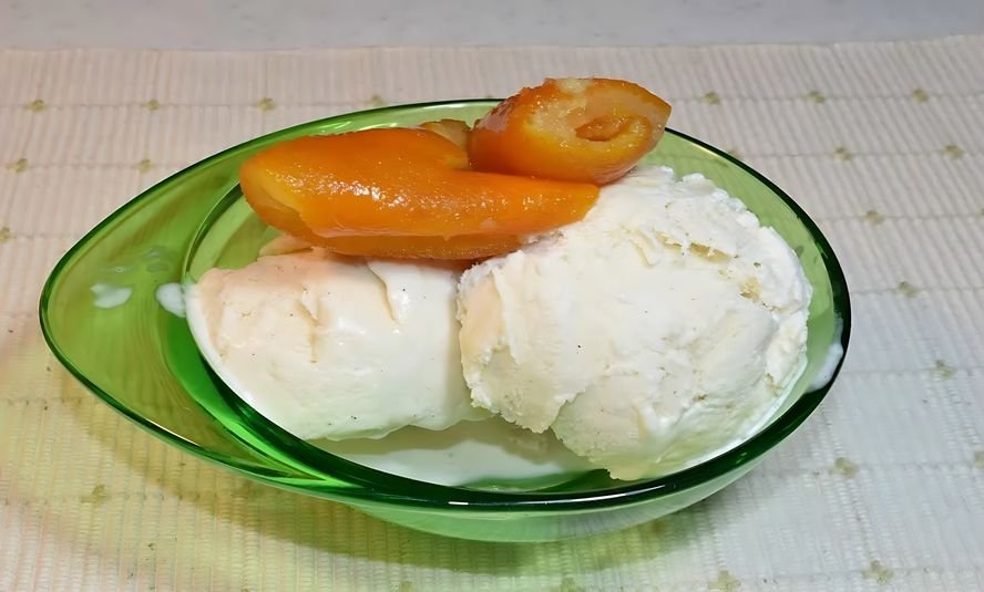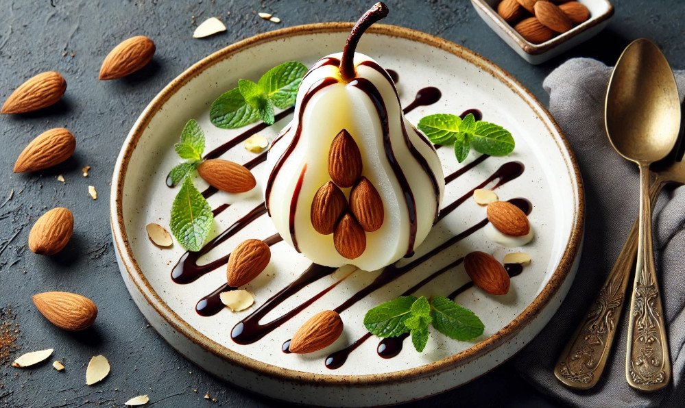 Αχλάδια σε Σιρόπι Μέντας Υλικά: 8 μεγάλα αχλάδια 70 γραμμάρια αποφλοιωμένα αμύγδαλα 400 γραμμάρια ζάχαρη 360 ml νερό 2 κουταλάκια του γλυκού υγρό άρωμα βανίλιας
