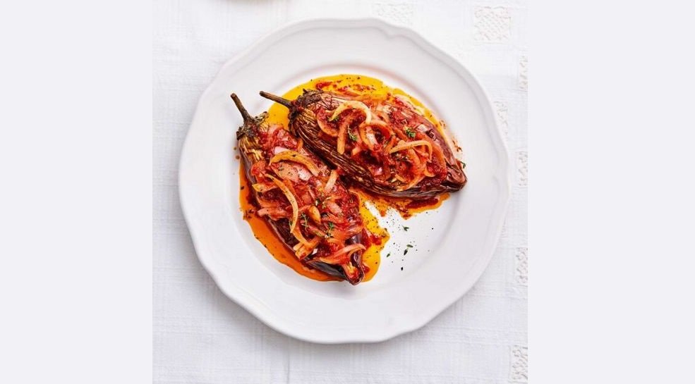 Ψητές μελιτζάνες Εκλεπτυσμένη εναλλακτική της μελιτζάνας με φέτα και ντομάτα Υλικά:4 μέτριες ντομάτες, κομμένες στη μέση1 κρεμμύδι κομμένο στη μέση κατά μήκος1/4 φλ. τσαγιού ελαιόλαδοΑλάτι