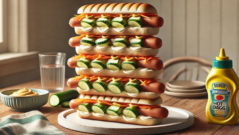 Σάντουιτς με Λουκάνικα Υλικά: 2 ατομικά ψωμάκια για σάντουιτς 2 λουκάνια Φρανκφούρτης 1 μέτριο αγγούρι 1 καρότο 3 κουταλιές μαγιονέζα μουστάρδα (πικάντική ή απαλή) Για