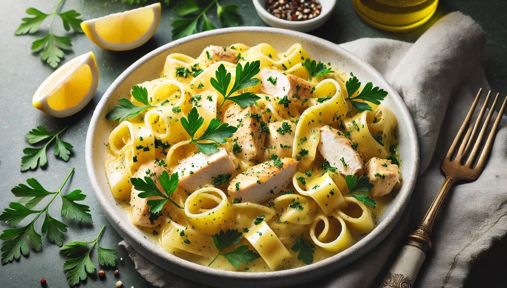 Παπαρδέλες με Κρέμα και Κοτόπουλο Υλικά: 2 πακέτα παπαρδέλες (περίπου 500 γρ.) 400 γρ. κοτόπουλο σε κυβάκια 2 σκελίδες σκόρδο, σε φετάκια 1/2 κρεμμύδι, ψιλοκομμένο