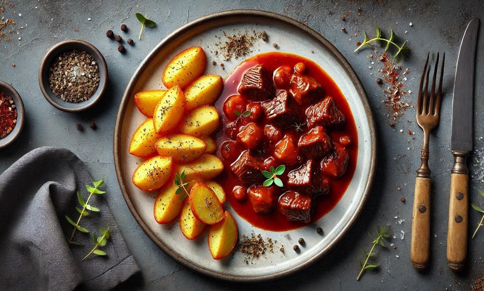 Μοσχάρι Κοκκινιστό Υλικά: 800 γρ. μοσχάρι, κομμένο σε κύβους 1 μεγάλο κρεμμύδι, ψιλοκομμένο 1 μέτριο καρότο, ψιλοκομμένο 1 σκ. σκόρδο, ψιλοκομμένη 1 1/2 κ.σ. πελτέ