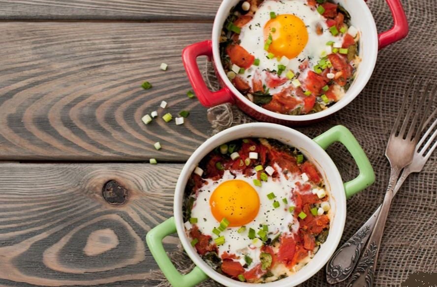 Ψητά αβγά με σπανάκι Υλικά: 4 αβγά 100 γρ. σπανάκι 400 γρ. ντομάτες ψιλοκομμένες 1 κ. γλ. νιφάδες τσίλι Εκτέλεση Βήμα 1Προθερμάνετε το φούρνο στους