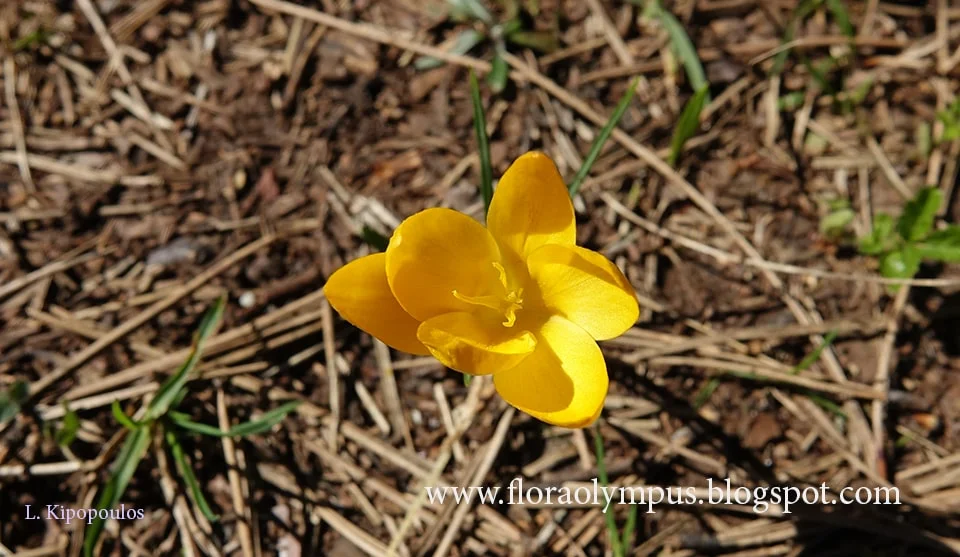 Ο Crocus flavus, είναι είδος βαλκανικό και συναντάται στα βουνά της Κεντρικής και Βόρειας Ελλάδας. Στον Όλυμπο και στα Πιέρια όρη συναντάται στα 400-1000 μ. Τα άνθη είναι χρυσοκίτρινα. Οι στήμονες και τα στίγματα είναι πιο κοντά από το περιάνθιο, οι δε ανθήρες είναι κίτρινοι. Ανθίζει τους μήνες Φεβρουάριο-Μάρτιο, ανάλογα με το υψόμετρο.