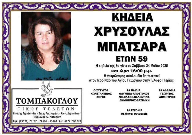 Η κηδεία της θα τελεστεί σήμερα, Σάββατο 24 Μαΐου, στις 16:00 μ.μ., στον Ιερό Ναό Αγίου Γεωργίου, στην Έλαφο Πιερίας.