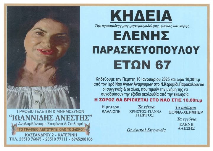Η κηδεία της θα γίνει την Πέμπτη 16 Ιανουαρίου, στις 10:30 π.μ. στον Ιερό Ναό Αγίων Αναργύρων στο Ν. Κεραμίδι.