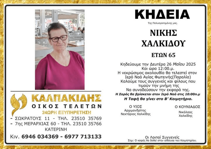 Με βαθιά οδύνη ανακοινώνουμε την απώλεια της Νίκης Χαλκίδου, η οποία έφυγε από τη ζωή σε ηλικία 65 ετών. Η είδηση του θανάτου της σκόρπισε θλίψη σε συγγενείς, φίλους και όλους όσοι είχαν την τύχη να τη γνωρίσουν.