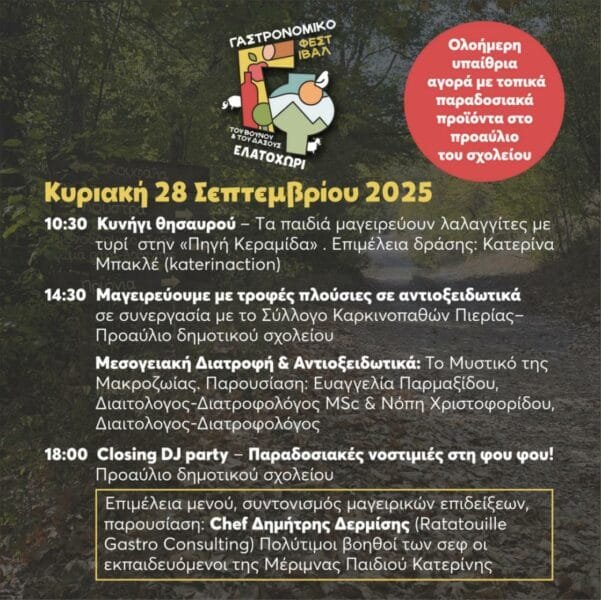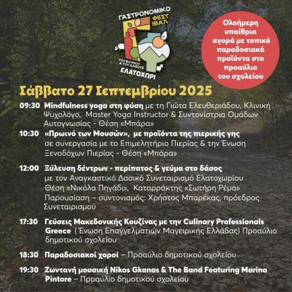 To πρόγραμμα του Γαστρονομικού Φεστιβάλ Ελατοχωρίου που θα πραγματοποιηθεί το Σάββατο 27 και Κυριακή 28 Σεπτεμβρίου 2025.