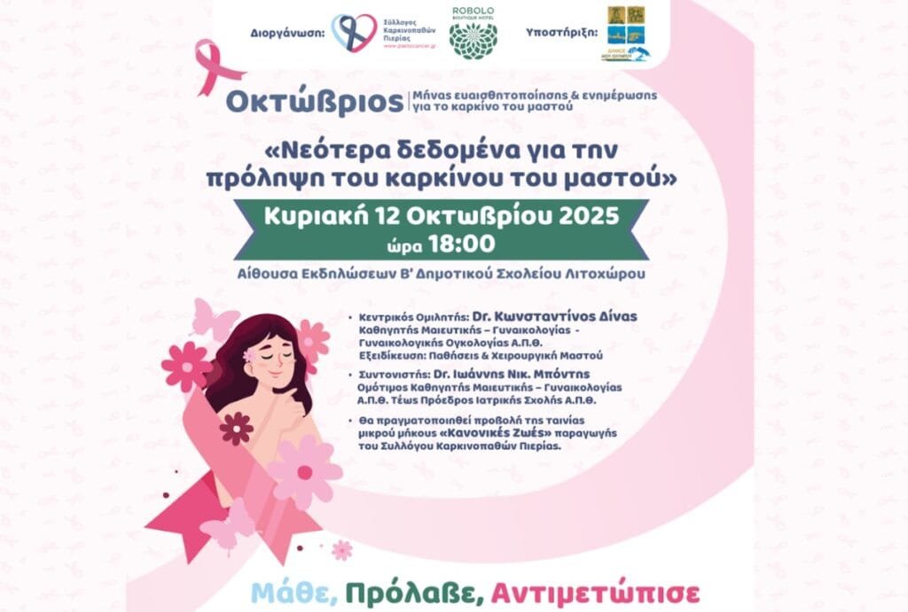 Με αφορμή τον Οκτώβριο, μήνα αφιερωμένο στην ενημέρωση και πρόληψη του καρκίνου του μαστού, ο Σύλλογος Καρκινοπαθών Πιερίας, σε συνεργασία με το Robolo Boutique Hotel by H&T, σας προσκαλούν στην ενημερωτική εκδήλωση με θέμα «Νεότερα δεδομένα για την πρόληψη του καρκίνου του μαστού» την Κυριακή 12 Οκτωβρίου 2025 (ώρα 18:00) στην αίθουσα εκδηλώσεων του 2ου Δημοτικού Σχολείου Λιτοχώρου.