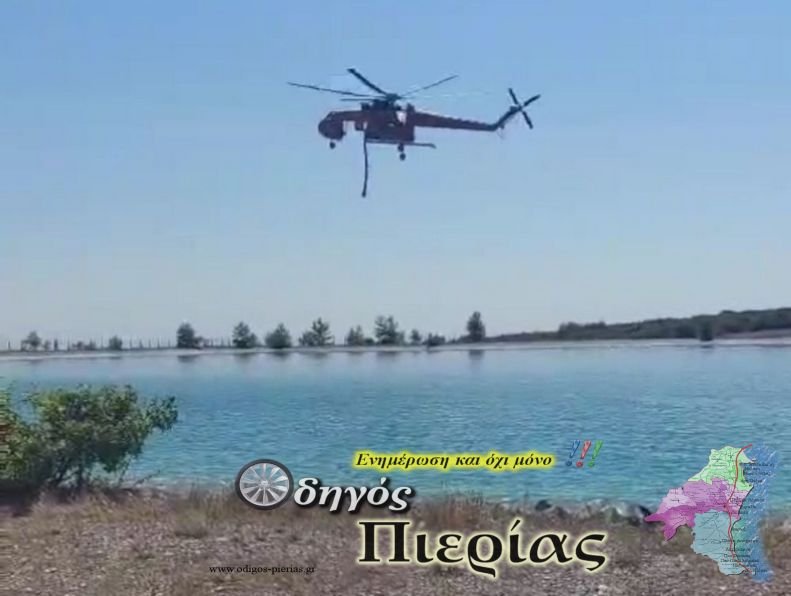 Το ελικόπτερο παίρνει νερό από την τεχνιτή λιμνοδεξαμενή άδρευσης στην Βροντού Πιερίας.