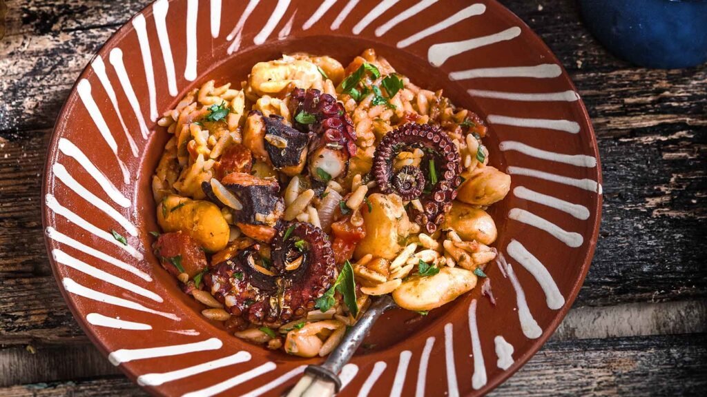 Ταυτόχρονα ετοιμάζουμε το χταπόδι. Καθαρίζουμε το χταπόδι και το βάζουμε σε μικρή κατσαρόλα με λίγο νερό, ίσα που να το σκεπάζει, λίγους κόκκους πιπέρι και 1 δαφνόφυλλο. Διαβάστε όλα τα μυστικά για να διαλέξετε και να μεγειρέψετε σωστά το χταπόδι εδώ.