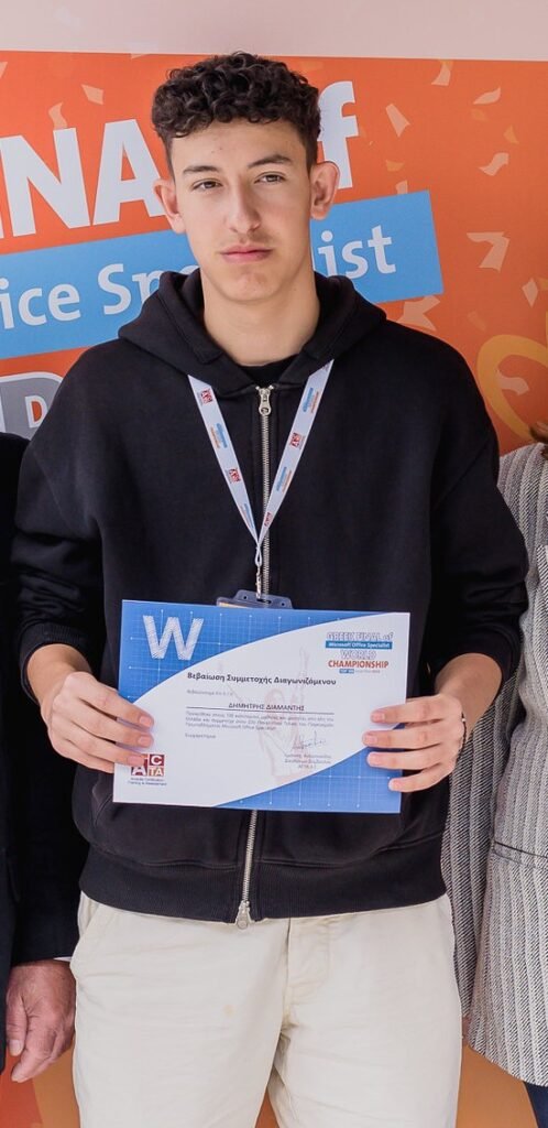 Δημήτρης Διαμαντής – Μαθητής Γ’ Λυκείου από το Λύκειο Κάτω Μηλιάς, διαγωνίζεται στην ενότητα Word. Πέρσι κατέκτησε την 9η θέση πανελλαδικά, και φέτος στοχεύει ακόμη ψηλότερα, υπό την καθοδήγηση της Γεωργίας Μαρουσιάδου. Το δίδυμο έχει θέσει ξεκάθαρο στόχο: Πανελλήνιο μετάλλιο.