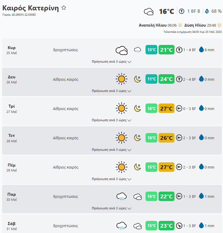 Πρόγνωση καιρού για επόμενη εβδομάδα Κυριακή 25 έως και Σάββατο 31 – 05 – 2025.