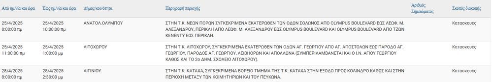 Σύμφωνα με ανακοίνωση του ΔΕΔΔΗΕ έχει προγραμματιστεί η παρακάτω διακοπή ρεύματος στις 25/04, 28/04.