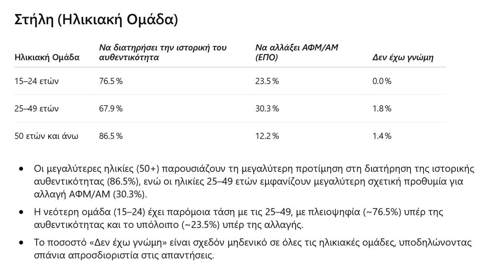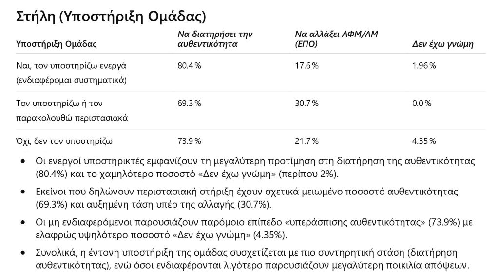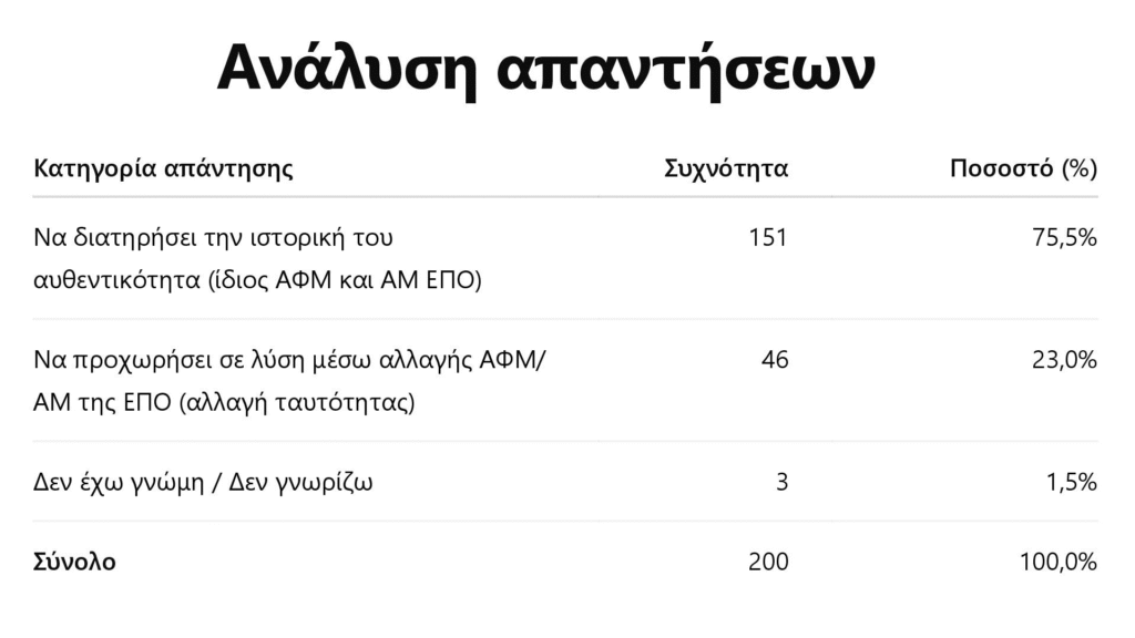 Η ανάλυση δείχνει ότι η συντριπτική πλειονότητα των ερωτηθέντων (περίπου 75,5%) υποστηρίζει τη διατήρηση της ιστορικότητας του συλλόγου (ίδιο ΑΦΜ/ΑΜ ΕΠΟ).
