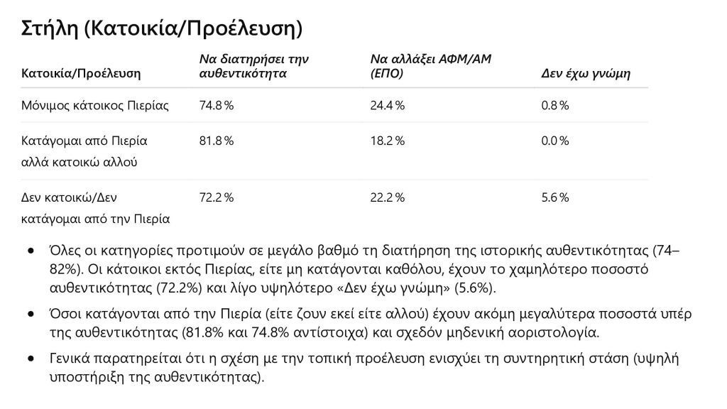 ΚΥΡΙΟ ΣΥΜΠΕΡΑΣΜΑ: Από την κατανομή αυτή προκύπτει ότι οι ερωτηθέντες είναι σαφώς υπέρ της διατήρησης της ταυτότητας «ΣΦΚ Πιερικός». Το γεγονός ότι τόσο μεγάλο ποσοστό (3 στους 4) επιλέγει την πρώτη επιλογή υποδηλώνει ότι η κοινότητα θέλει να διατηρηθεί «η ιστορική αυθεντικότητα του Συλλόγου». Η σχετικά μικρή υποστήριξη για την εναλλακτική λύση δείχνει ότι ελάχιστοι συμφωνούν με την αλλαγή (νέο ΑΦΜ/ΑΜ ΕΠΟ). Συνολικά, η ποσοστιαία κατανομή των απαντήσεων υποστηρίζει την άποψη ότι οι ερωτηθέντες δίνουν έμφαση στη διατήρηση της ιστορικής συνέχειας του Πιερικού.